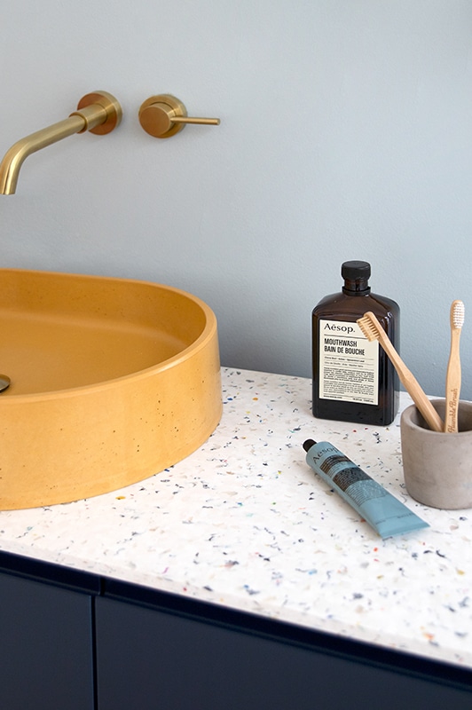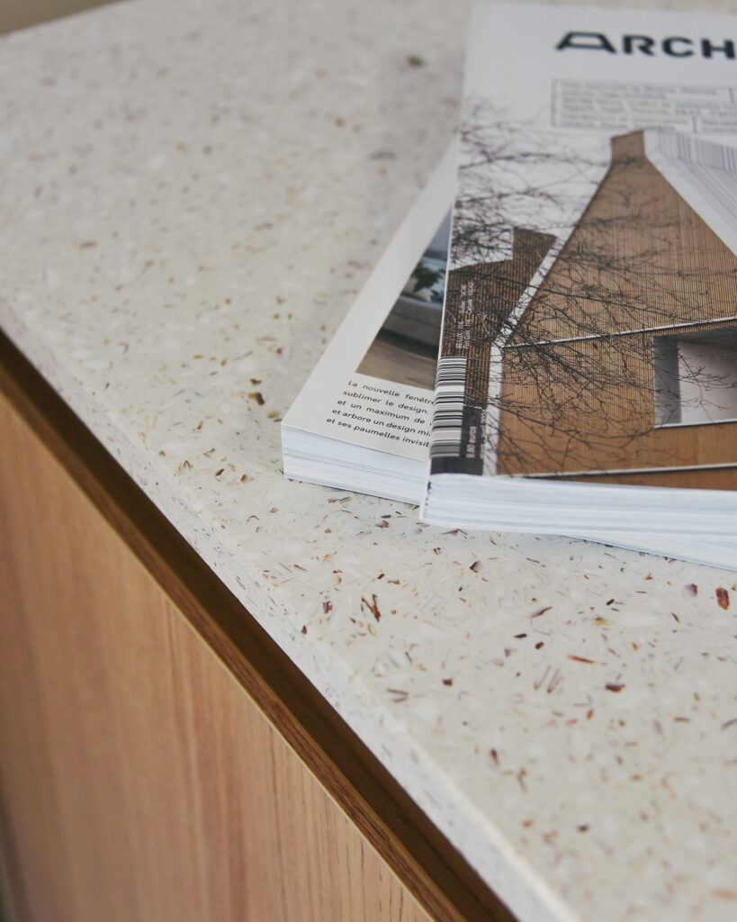 Contrairement aux idées reçues, Le Pavé n’a rien à voir avec un vulgaire plastique : sa finition est lisse, élégante, avec un aspect qui peut rappeler le terrazzo selon les broyats intégrés.