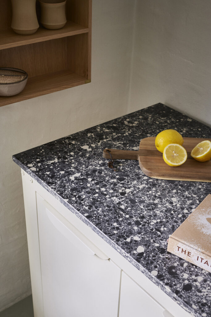 L’aspect visuel est tout simplement bluffant. Le rendu rappelle le terrazzo italien ou le granit, avec un effet graphique unique où chaque pièce devient une œuvre d’art. Les fragments de coquillages créent des motifs naturels impossibles à reproduire, ce qui signifie que votre plan de travail sera absolument unique.